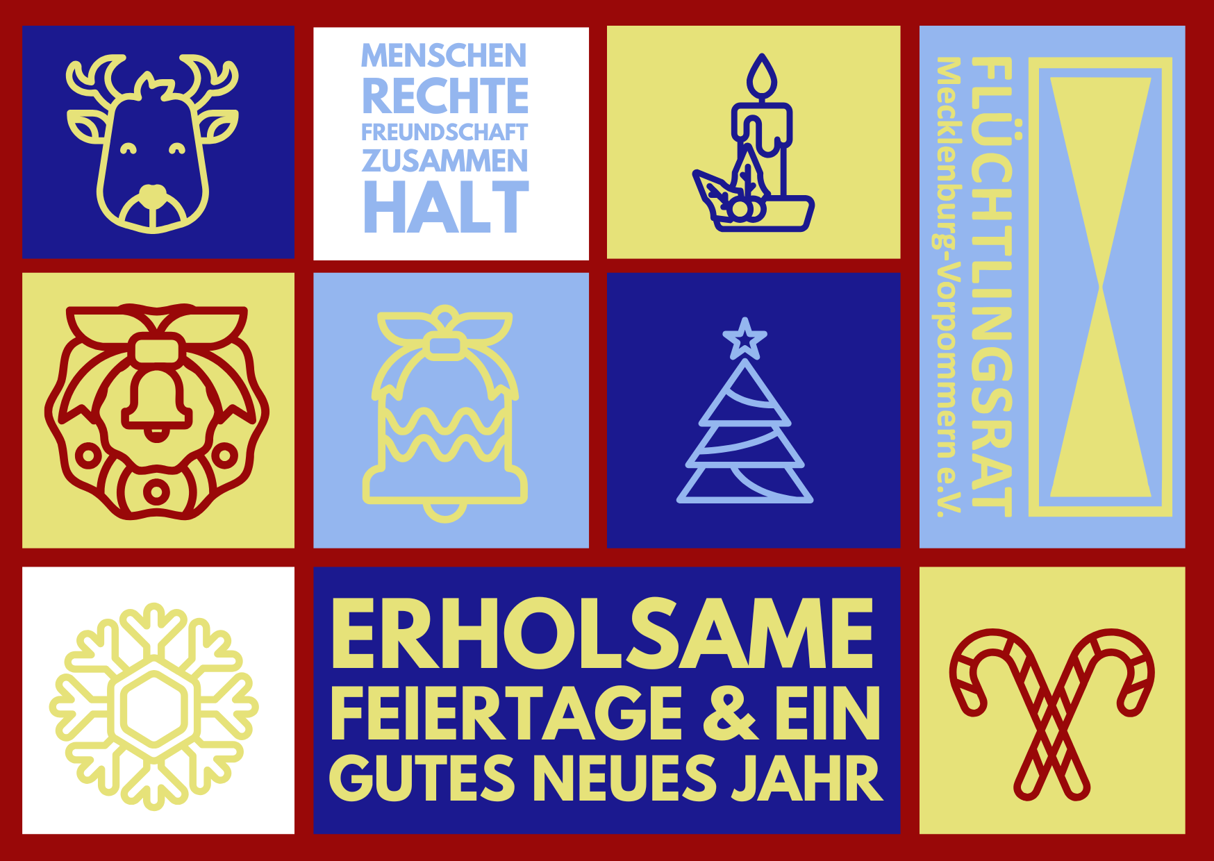Das Team des Flüchtlingsrats Mecklenburg-Vorpommern wünscht erholsame Feiertage und einen guten Start in 2026. Wir freuen uns schon jetzt auf das kommende Jahr mit Ihnen – wohlwissend, dass viel Arbeit auf uns wartet.